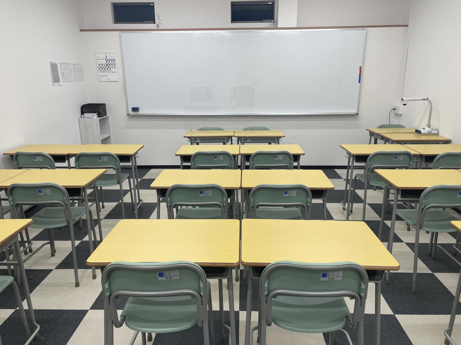 自習室(自習ブース)有・大教室に最新のプロジェクター完備・個別指導教室有・男女別トイレ・校舎前に約5台分の有駐車場・道路にコンビニ有向かい